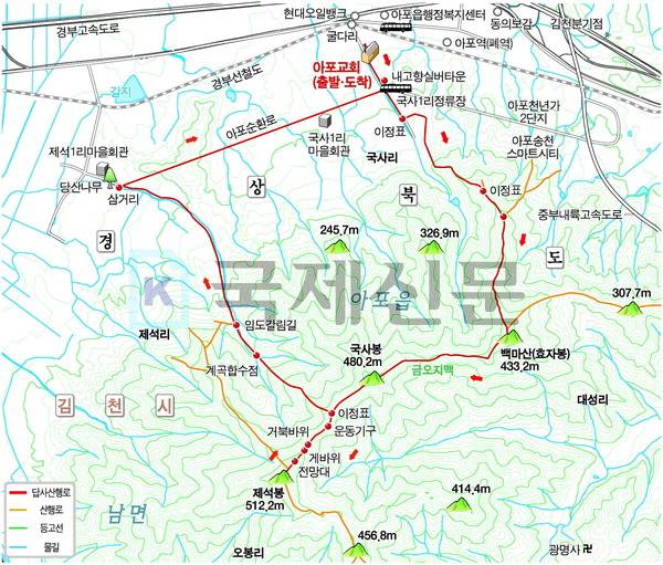 최고봉인 제석봉은 금오산(976.5m)의 유명세에 가려져 있다가, 정상에 쌓은 돌탑이 대중매체에 소개되면서 외부에 알려진 산이다. 63세이던 박순대 씨가 허리디스크로 고생하다가 수술하고 2007년 4월부터 새벽마다 산을 오르며 정상까지 돌을 져 날라 4년 동안 정성을 다해 돌탑을 쌓고는 병이 회복됐다고 한다. 근교산&그 너머 취재팀은 병을 치유하는 상징과 같은 곳이 된 제석봉 돌탑의 기운과 금오산의 정기를 받는 경북 김천 백마산~국사봉~제석봉을 소개한다.