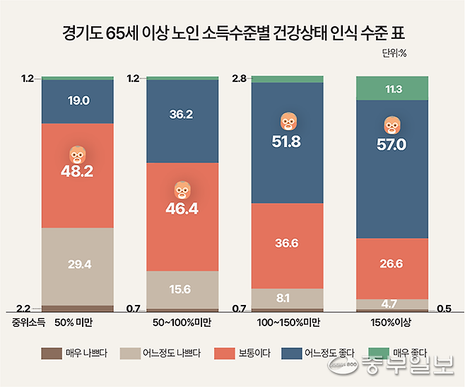 특히 중위소득 150%(월평균 가구소득 약 684만 원) 이상 노인의 경우, '매우 나쁘다'는 0.5%, '어느 정도 나쁘다'는 4.7%로 총 5.2%에 그쳤지만, 중위소득 50% 미만(월평균 약 130만 원) 노인은 '매우 나쁘다' 2.2%, '어느 정도 나쁘다' 29.4%로 총 31.6%가 건강이 나쁘다고 응답하는 등 차이를 보였다.