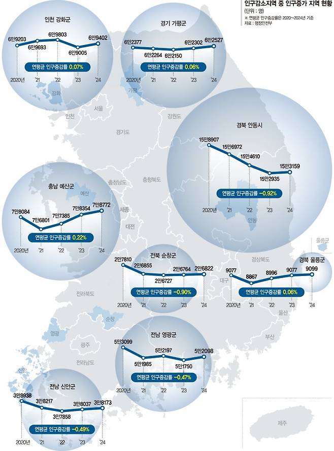 소멸위험지역인 신안군과 순창군도 인구가 늘어나는 성과를 봤다. 신안군은 1년 0.36%, 2년 0.42% 증가했다. 4년 기준으로는 0.49% 감소로 집계됐다. 순창군은 1년 0.22%, 2년 0.18% 증가했지만 4년 기준은 0.90% 감소다. 두 지역은 2022년을 전후로 인구수가 바닥까지 갔다가 꾸준한 인구증가 정책으로 상승 반전했다. 인구 감소로 홍역을 앓던 강화군, 영광군, 안동시는 지난해 처음으로 증가로 전환한 지역이다.