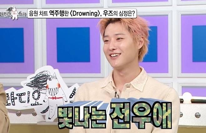 이날 우즈는 지난 2024년 국군의 날 특집 무대에서 부른 '드라우닝' 영상이 1,900만 뷰를 기록하며 음원 차트 역주행을 이끈 비하인드를 공개했다. '드라우닝'은 입대 1년 전인 2023년에 발매됐던 곡이다.