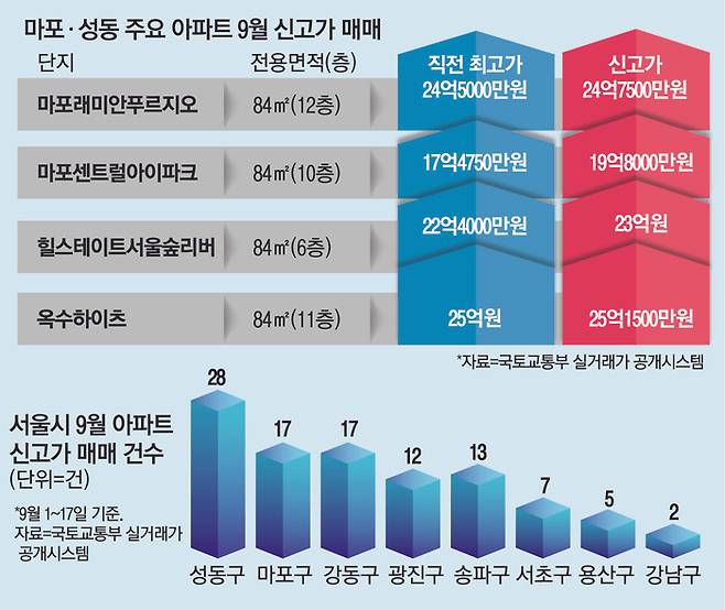 17일 부동산 업계에 따르면 정부의 9·7 대책 이후 마포구와 성동구에서 신고가 거래가 연이어 체결되고 있다. 지난 주말 마포구 대장주 아파트 ‘마포래미안푸르지오’ 전용면적 84㎡는 열흘 새 직전 신고가보다 1억원 이상 뛴 26억원에 거래됐다.