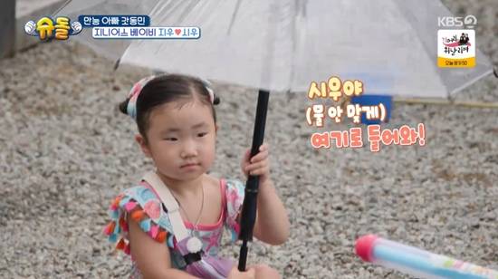 이어 지우는 우산을 펴고 "시우야 여기 들어와라"라며 동생 보호에 나섰다. 박수홍은 "어떻게 저러냐"라며 놀람을 숨기지 못했다. 장동민이 동생을 공격하자, 지우는 직접 동생에게 우산을 씌워줬다. 안영미도 "계속 누나가 지켜주고 있다"라며 감탄했다.