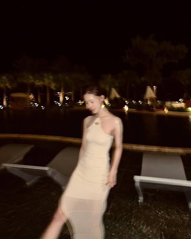 누드톤의 슬리브리스 롱 드레스 착장도 공개돼 눈길을 끈다.