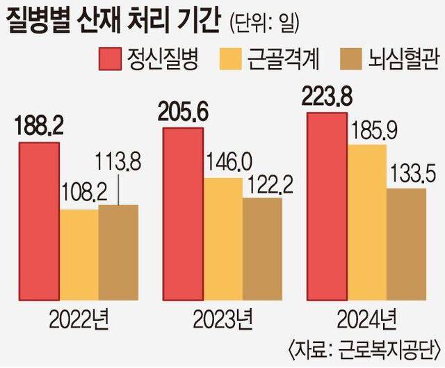 지난해 기준 정신질병 산재 처리 기간은 평균 223.8일로 근골격계(185.9일)나 뇌·심혈관(133.5일)보다 길다. 정신질환 산재 처리에 걸리는 시간도 2022년(188.2일) 이후 매년 늘고 있다. 정신질환 산재 신청·승인 건수, 정신질환으로 인한 자살 산재 건수 역시 최근 3년간 증가세다.