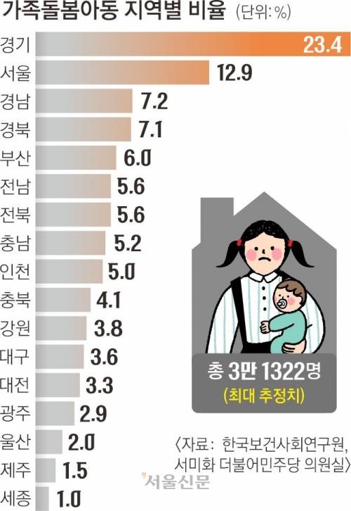 17일 서미화 더불어민주당 의원이 공개한 한국보건사회연구원 연구용역 보고서 ‘13세 미만 가족돌봄아동 현황 및 지원방안 연구’에 따르면 사회보장 행정데이터를 활용해 추정한 13세 미만 가족돌봄아동 규모는 최소 1만 7647명에서 최대 3만 1322명으로 집계됐다. 지역별로는 경기 7316명(23.4%), 서울 4054명(12.9%), 경남 2256명(7.2%), 경북 2212명(7.1%), 부산 1877명(6.0%) 순으로 많았다.