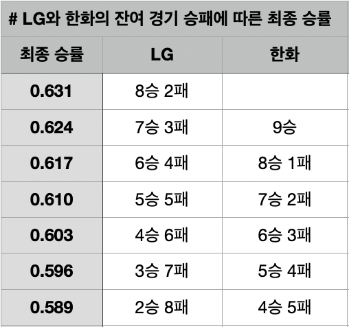 남은 경기에서 LG가 6승4패를 한다면, 한화는 8승1패를 해야 동률이 된다.