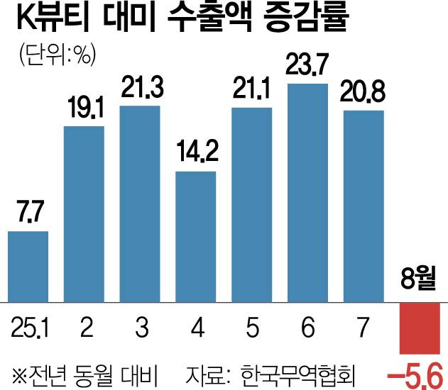 K뷰티의 8월 대미 수출액이 30개월 만에 처음으로 감소한 것으로 나타났다.