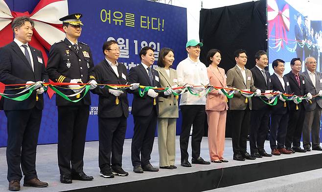 | 첫 테이프는 끊었지만… 서울의 새 수상 교통수단인 ‘한강버스’ 정식운항 개시 하루 전인 17일 서울 한강버스 여의도선착장에서 열린 취항식에서 오세훈 서울시장(왼쪽 여섯 번째) 등 참석자들이 기념사진을 찍고 있다.이제원 선임기자 |