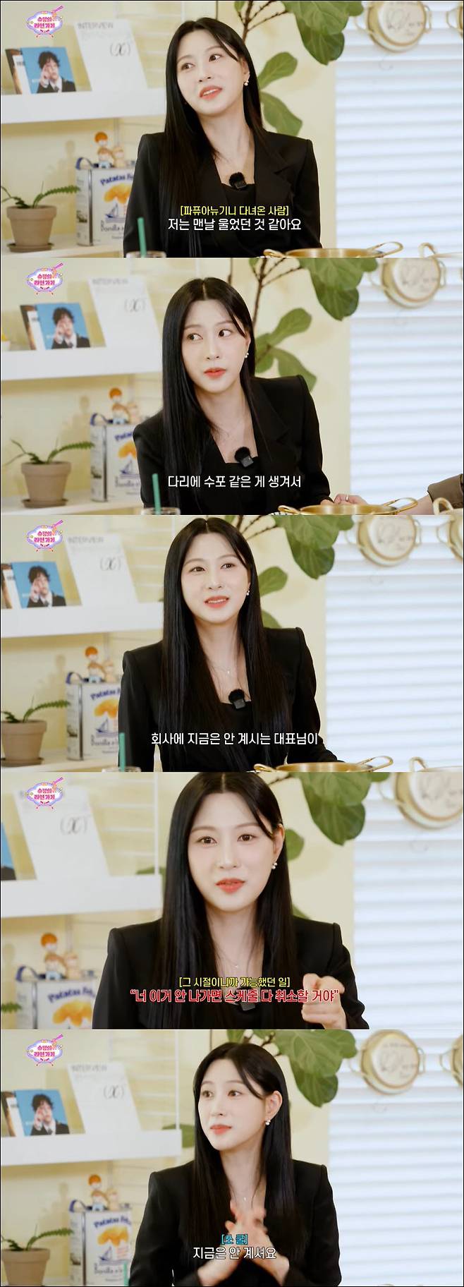 시우민은 "자진해서 나간 거냐. 아니죠. 끌려간 거죠"라고 물었고 오하영은 "저는 아니다. 지금은 안 계시는 대표님이 '너 이거 안 나가면 스케줄 다 취소할 거야' 그러셔서 어쩔 수 없이 나갔다. 지금은 안 계신다"고 솔직히 밝혔다. 이에 박초롱도 처음 듣는 듯 "진짜?"라고 깜짝 놀랐다.