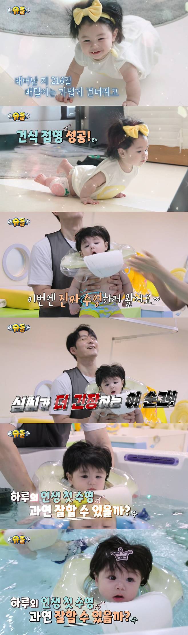 영상 속에는 수영에 도전하는 심형탁의 아들 하루의 모습이 담겼다. 앞서 하루는 태어난지 216일에 배밀이는 건너뛰고 상체 힘으로 땅 위에서 접영을 하듯 건식 접영에 성공했던 바.