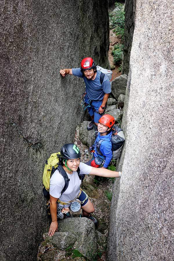 이어지는 침니 구간을 짧게 등반해 올라간다. 나드리길의 매 구간은 로프를 깔기 애매할 정도로 짧거나 등반성이 없어 대부분 확보 없이 등반해 올라갔다. 해가 들지 않는 곳은 이틀 전 내린 비로 바위가 아직 미끄럽다. 워킹구간이 많아 암벽화가 아닌 리지화로 등반하고 있던 탓에 바위가 더욱 미끄럽게 느껴진다. 평소 같았으면 문제없이 올랐을 침니 구간도 긴장되고 떨린다. 줄 없이 바위를 오르내리는 일은 드문 일이다. 어렵지 않은 구간에서도 초집중, 초긴장이다. 매 구간 이어지는 짧은 등반이 끝날 때마다 안도의 한숨을 쉬며 조금씩 전진해 나갔다.