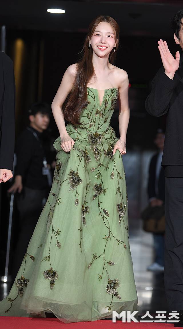 가수 겸 배우 방민아는 그린 플로럴 드레스로 상큼 발랄한 매력을 발산했다. 숲속 요정을 연상시키는 디자인에 환한 미소가 더해져 레드카펫 현장을 화사하게 물들였다.