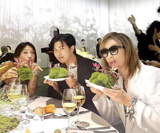 이어진 사진에서는 RM과 DJ 페기 구와 사이좋게 인증샷을 남기는가 하면, 블랙핑크(BLACKPINK) 로제, 지수, 리사, 모델 안소연, 투애니원 씨엘과도 사이좋게 사진을 찍어 시선을 모았다.