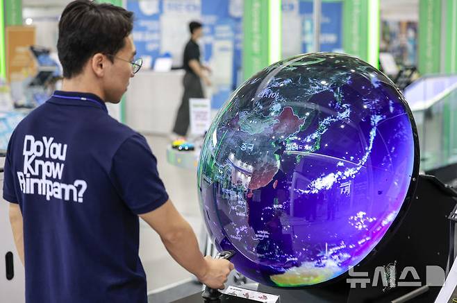 [서울=뉴시스] 정병혁 기자 = 18일 서울 강남구 코엑스에서 열린 에듀테크 코리아 페어에서 참관객이 구형 디스플레이로 세계지도를 살펴보고 있다. 2025.09.18. jhope@newsis.com