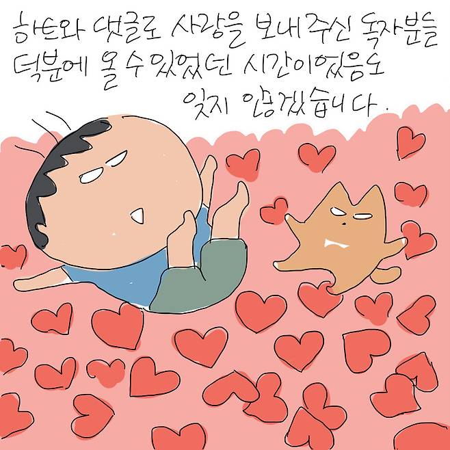 총 167편의 소소한 일상은 애니멀피플 연재(https://www.hani.co.kr/arti/SERIES/1426)에서 언제든 다시 보실 수 있습니다. 앞으로 스페셜 단행본으로 출간될 ‘너와 추는 춤’도 많은 기대 부탁드립니다.