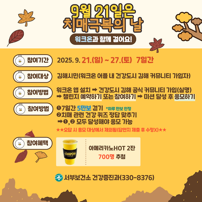 김해시서부보건소가 오는 21일부터 27일까지 모바일 걷기 앱 ‘워크온’을 활용해‘치매 극복 걷기 챌린지’를 운영한다.