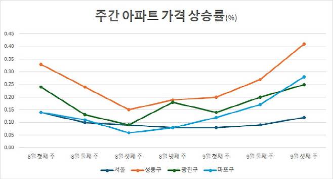 9.7대책 후 서울 집값 더 올랐다 부동산원, 9월 셋째 주 주간아파트 동향 발표 서울 아파트 0.12%↑, 2주 연속 상승폭 확대 성동구 0.41% 급등세, 4주 째 올라 "9.7대책 후 조정 기다리던 매수 수요 유입"