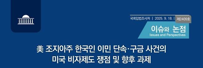 | ▲ 국회입법조사처는 18일 "美(미) 조지아주 한국인 이민 단속·구금 사건의 미국 비자제도 쟁점 및 향후 과제"라는 제목의 현안보고서를 발간했다. |