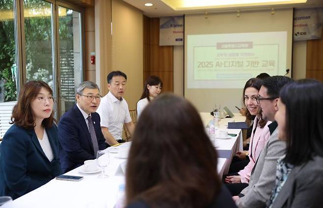 [서울=뉴시스] 정근식 서울시교육감이 18일 서울 베스트웨스턴 강남호텔에서 메르세데즈 마테오 미주개발은행(IDB) 교육 최고책임자 및 관계자들과 만나 양 기관 간 디지털 교육 정책 교류 및 협력 방안을 논의하고 있다. (사진=서울시교육청 제공) 2025.09.18. photo@newsis.com *재판매 및 DB 금지