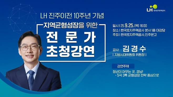 이번 강연회는 한국토지주택공사, 진주문고가 공동으로 'LH 진주 이전 10주년 기념'해 마련하고, 주제는 "청년이 머무는 곳, 경남-5극 3특 균형성장 전략 중심으로"이다.