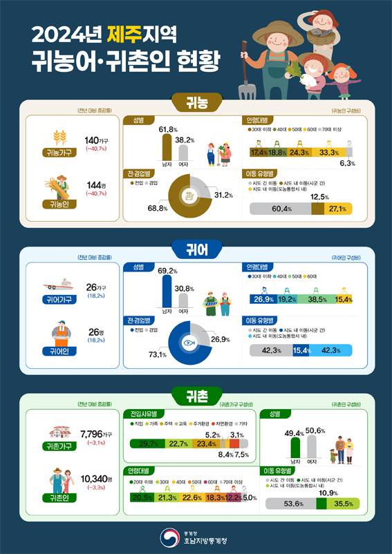 귀농가구수는 2021년(248가구)을 정점으로 3년 연속 감소해 지난해 140가구에 그쳤다. 전년대비 감소율이 40.7%로 부산(-60.0%)에 이어 두번째로 높았다.<헤드라인제주>