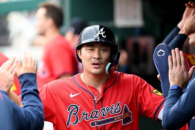| ▲ 2025년 9월 18일(한국시간) 워싱턴 D.C.의 내셔널스 파크에서 열린 경기에서, 애틀랜타 브레이브스의 김하성이 6회에 득점한 후 팀 동료들과 함께 기뻐하고 있다. |