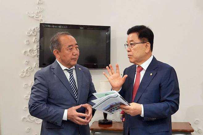 [서울=뉴시스] 김광림(오른쪽) 새마을운동중앙회장이 18일 경북 라한셀렉트 경주에서 쿠다이베르겐 바자르바예프 키르기스스탄 공무지방자치청장과 의견을 나누고 있다. (사진=새마을운동중앙회 제공) 2025.09.18. photo@newsis.com *재판매 및 DB 금지