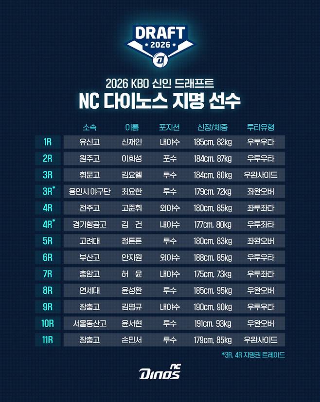 NC는 지난 17일 열린 신인 드래프트에서 한화 이글스(3라운드) SSG 랜더스(4라운드)와 트레이드로 얻은 지명권 2장을 더해 총 13명을 선발했다.