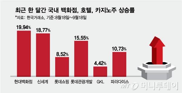 백화점주의 강세는 이미 지난 7월 말 1차 민생회복 쿠폰 지급으로 내수 소비가 살아나고 외국인 관광객이 늘어난 데서 비롯됐다.