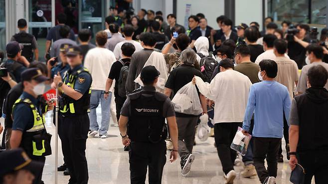 ▲ 미국 이민당국에 의해 조지아주에 구금됐던 한국인 근로자들이 12일 영종도 인천국제공항 제2여객터미널 입국장을 나서고 있다.