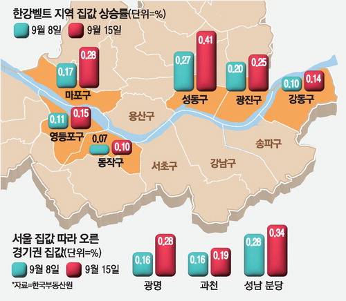 서울 마포·성동 등 강남권 인접 한강벨트 지역과 경기권 선호 지역의 집값이 들썩이는 건 정부의 '규제 확대' 기조 때문이다. 규제지역이 확대되거나 대출 규제가 더 강해질 수 있다는 불안감에 한강벨트로 매수세가 몰리는 것이다. 덩달아 준강남으로 꼽히는 경기권 선호 지역에서도 서울 집값을 따라가는 '갭 메우기' 장세가 보인다.