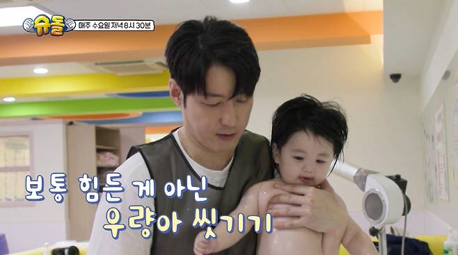 수영을 마친 뒤, 심형탁은 하루를 씻기기 위해 샤워실로 향했다. '초우량아' 하루의 목욕은 쉽지 않았다. 그는 "허리가 끊어질 것 같다. 차라리 데드리프트가 낫겠다"며 너스레를 떨었다.