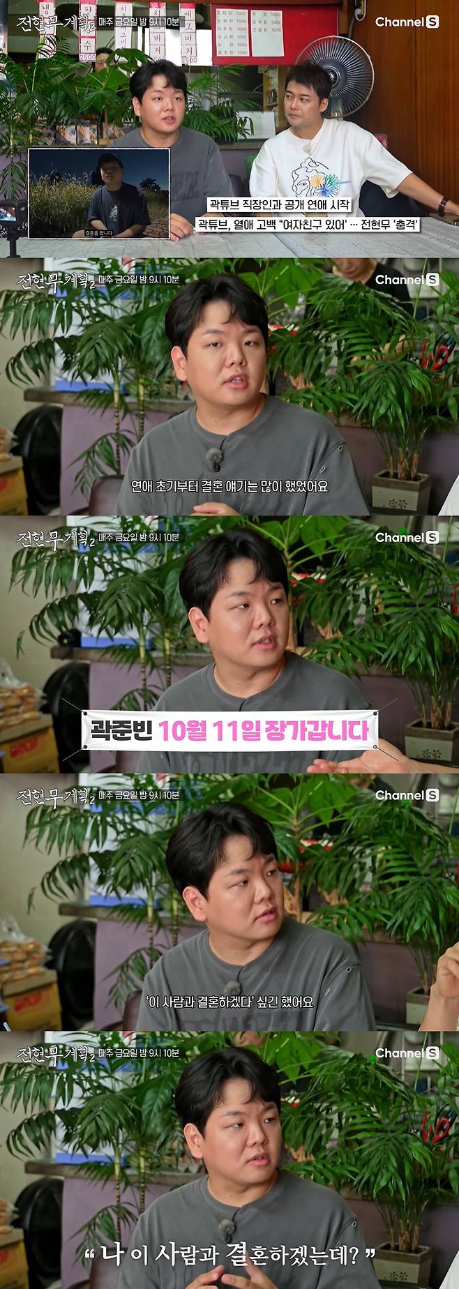 이날 곽튜브는 "연애 초기부터 결혼 이야기는 많이 했었다"며 "10월 11일에 결혼을 한다"고 발표했다. 그는 "솔직히 말하면 보자마자 '이 사람과 결혼하겠다' 싶긴 했다. 보자마자 느낌이 '이 사람과 사귀면 결혼하겠는데'라는 생각이 들었다"며 예비 신부와의 첫 만남을 떠올렸다. 이에 전현무는 "그런 사람이 있구나"라며 부러워했다.