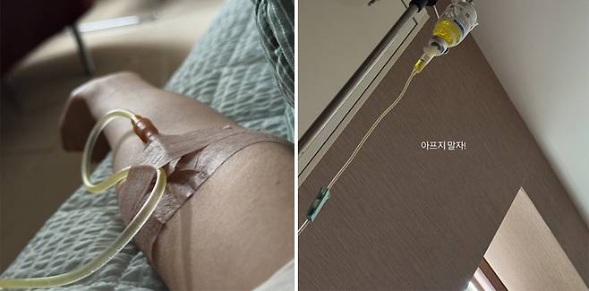공개된 사진애는 병원 침대에 누운 채 팔에 링거 줄이 연결되어 있고, 링거액이 천천히 주입되는 모습이 담겼다. 사진 중앙에는 “아프지 말자!”라는 짧은 글귀가 더해져 건강한 복귀를 염원하는 마음이 드러났다.