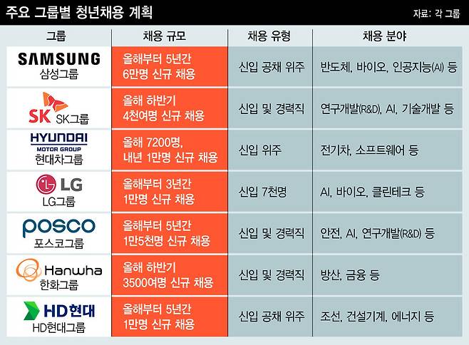 포스코그룹은 올해부터 5년간 1만5천명을 채용해 안전과 인공지능, 연구개발(R&D) 등에 집중하기로 했고, 한화그룹도 올해 하반기 중 3500여명을 뽑아 방산, 금융 등 주요 계열사에 배치할 계획이다.