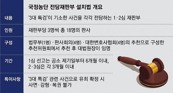 1심 사건은 공소 제기일로부터 6개월 이내, 항소심과 상고심은 각각 3개월 이내에 선고하도록 해 12개월 안에 확정판결을 내도록 했다. 전담재판부 판결문에는 모든 판사의 의견을 표시하고, 재판 과정의 녹화·촬영·중계를 원칙적으로 허용하기로 했다. 전담재판부에서 유죄 확정판결을 받으면 사면·감형·복권 대상에서 제외하는 내용도 담았다. 수사 단계에서 영장 청구는 서울중앙지법 전속 관할로 두되, 이를 전담할 영장전담재판관을 심급별로 한 명씩 둔다.