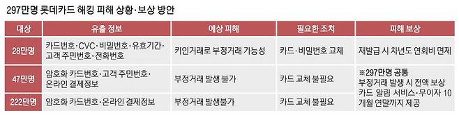 지난 7월 22일~8월 27일 롯데카드로 온라인 결제를 한 고객 중 일부인 297만명의 정보가 유출됐다. 이 중 탈취된 정보 수준이 가장 심각한 28만명에게는 롯데카드 측에서 18일에 개별적으로 문자메시지와 유선으로 안내를 한 상태다.