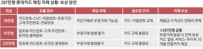 롯데카드 측은 피해 고객 전원에게 무이자 10개월 할부 서비스, 금융 피해 보상 서비스인 크레딧케어 및 카드 사용 알림 서비스를 연말까지 무료 제공한다는 방침이다.