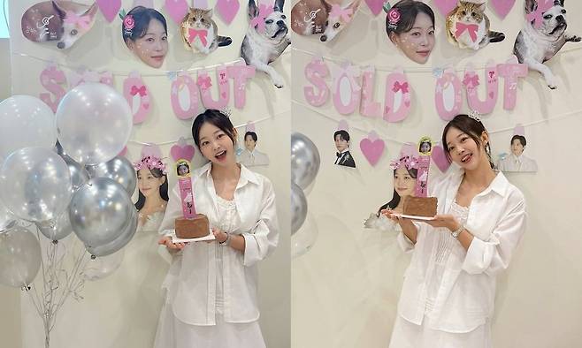 또 오랜 친구들과 함께한 브라이덜 샤워 사진을 공개하기도 했다. 케이크를 들고 새하얀 원피스와 면사포를 착용한 채 함박웃음을 짓고 있는 그의 모습이 흐뭇함을 자아냈다. '품절녀'를 의미하는 '솔드아웃(SOLD OUT)' 풍선 장식도 눈길을 끌었다.