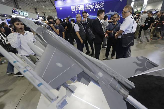 [타이베이=AP/뉴시스] 18일(현지 시간) 대만 타이베이 난강 전시센터에서 열린 2025 대만항공우주 및 방위산업 전시회(TADTE)에서 방문객들이 신제품을 살펴보고 있다. 2025.09.18.