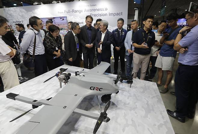 [타이베이=AP/뉴시스] 18일(현지 시간) 대만 타이베이 난강 전시센터에서 열린 2025 대만항공우주 및 방위산업 전시회(TADTE)에서 방문객들이 듀얼 파워 수직이착륙 무인기 '시걸'(HVTOL)을 살펴보고 있다. 2025.09.18.