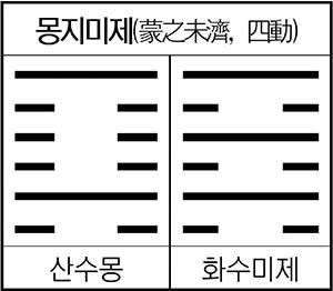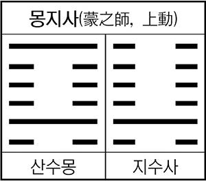 점사에서 몽의 육오<<각주=하락이수(河洛理數), 차효는 지성으로 현자를 임용해 다스리는 공을 이루는 자이다(是至誠以任賢 而治功成者也/시지성이임현 이치공성자야). 고로 협자는 어려서는 밝고 민첩하고 장년에는 겸공하며 혹 어려서 과갑하고 일찍이 조상의 음덕을 이어가며 군에게는 극진히 하고 민에게는 베푸는 도로 가히 추진해 행함에 막힘이 없다(幼而明敏 壯而謙恭 或幼童科甲 早承祖蔭, 致君澤民之道 可以推行無阻/유이명민 장이겸공 혹유동과갑 조승조음 치군택민지도 가이추행무조). 불협자는 명수를 편히 하고 분수를 지켜 온화한 빛으로 중생과 함께 한다(亦安常守分 和光同塵/역안상수준 화광동진). 세운(世運)에서 육오를 얻으면 벼슬한 자와 농공상은 모두 의지하고 붙여서 모사함을 헤아림에 순조롭게 된다(在仕 農工商 皆依附稱謨爲攸順/재사 농공상 개의부칭모위유순)>>를 얻으면, 어떠한 일도 자기 자신의 주장을 내세우지 말고 선생, 선배의 가르침이나 아랫사람(九二)의 말을 따라야 한다.