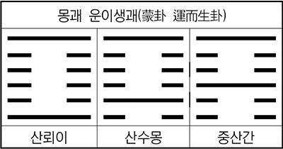 먼저 위의 괘상의 변화와 같이 운이생괘(運移生卦)를 해보면 몽괘는 산뢰이괘에서 와서 몽괘를 거쳐 중산간(重山艮)으로 가는 방법이 있고, 반대로 중산간에서 와서 몽괘를 거쳐 산뢰이(山雷頤)로 가는 방법도 있다.