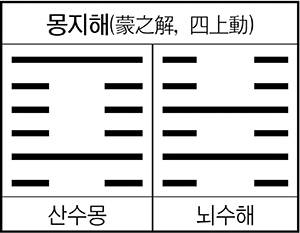 예컨대 유비는 제갈공명이 시키는 대로 진실로 따르면 난관을 헤쳐 나갈 수 있고 대업을 이룬다. 이를 효사에 ‘동몽 길’이라고 했으니 아이로 인해 기쁨의 좋은 일이 있다. 변괘가 풍수환(風水渙)으로 환계는 길괘로 ‘어려움이 풀린다’는 뜻이다.