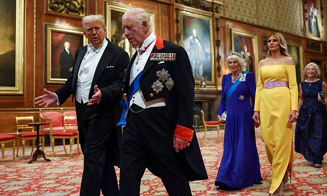 | 뜨거운 환대 영국을 국빈 방문한 도널드 트럼프 미국 대통령(왼쪽)이 17일(현지시간) 런던 근교 윈저성에서 영국 국왕 찰스 3세(왼쪽 두번째)와 대화하며 만찬장으로 이동하고 있다. 영국 커밀라 왕비(왼쪽 세번째)와 트럼프 대통령의 배우자 멜라니아 트럼프 여사가 뒤따랐다. 윈저=로이터연합뉴스 |