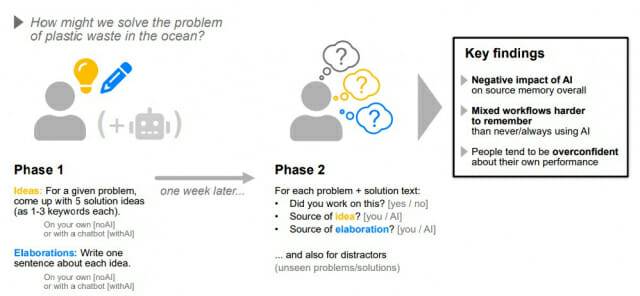 연구진은 184명의 참가자를 대상으로 문제 해결 아이디어 생성과 텍스트 작성 실험을 진행했다. 1단계에서 참가자들은 AI 없이 혹은 GPT-4o 미니 기반 챗봇과 함께 아이디어를 생성하고 한 문장으로 설명하는 작업을 수행했다. 일주일 후 2단계에서는 각 아이디어와 설명 텍스트의 출처가 본인인지 AI인지 기억해 내도록 했다.