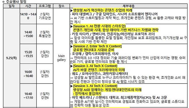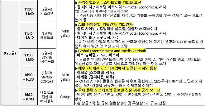 한국 콘텐츠 스타트업의 혁신적인 도약과 해외진출을 지원하기 위해 ▲강연(컨퍼런스) ▲실무강연(워크숍) ▲테크 셀레스터(배우 이제훈) Startup: CONcert ▲배틀필드(Battle Field) 등 다채로운 프로그램을 준비한다.
