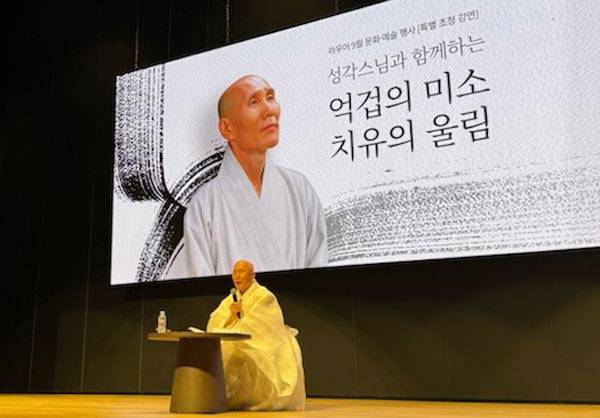 경남 남해 망운암 주지 성각 스님은 지난 17일 부산 기장군 라우어 실버타운에서 입주민을 대상으로 '억겁의 미소와 치유의 울림'이라는 주제로 특별강연(사진)을 했다.