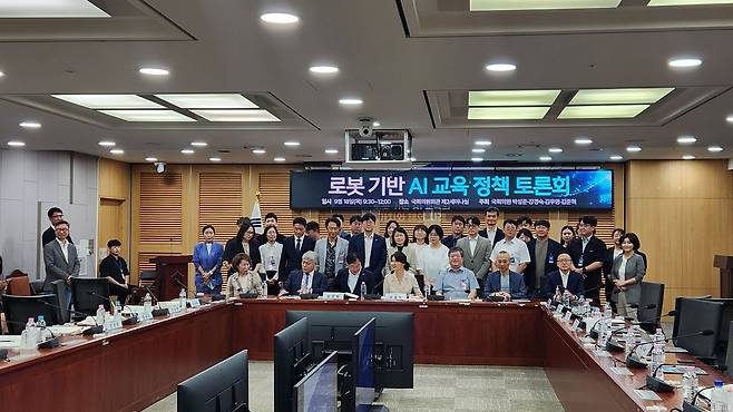 | ▲ 로봇 기반 AI 교육의 미래를 그리다: 정책 토론회 기념 촬영 국회에서 열린 로봇 기반 AI 교육 정책 토론회에 참석한 국회의원, 학계 전문가, 교육 현장 관계자들이 기념 촬영을 하고 있다. 미래 세대 교육의 중요성을 함께 인식하고, 혁신적인 정책 방향을 모색하기 위해 한자리에 모인 협력의 순간이다. |