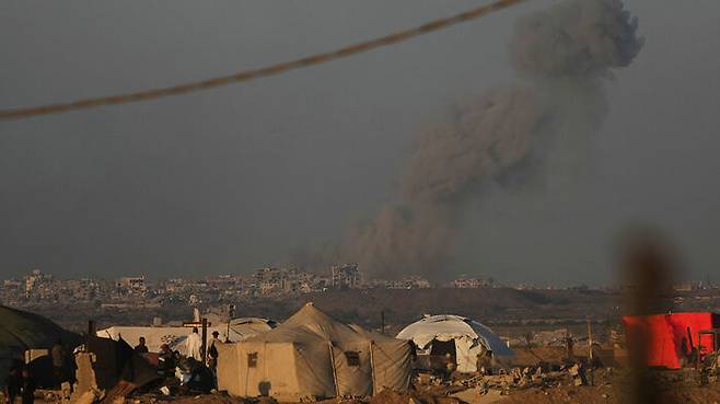 ▲ 현지시간 17일 가자 지구 중심부에서 이스라엘군의 폭격으로 연기가 피어오르는 모습
